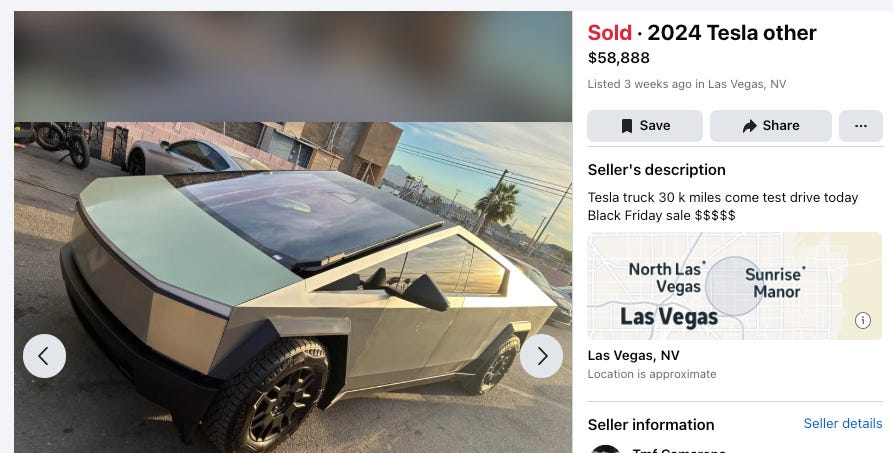 A $110,000 Model S for $50,000. Model 3s for $20k. A one-year-old Cybertruck for $40,000 off.