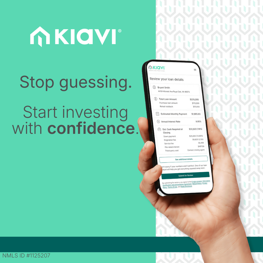 From first-time investors to seasoned pros, Kiavi’s AI-powered platform empowers you with the capital, confidence, and speed you need to build wealth through real estate.