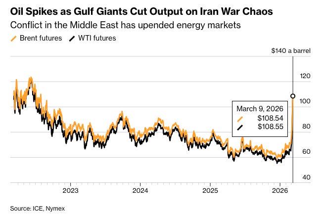 Oil jumped in the first 48 hours of the conflict, then ripped into March 8 and 9 with intraday spikes nearing 120 dollars per barrel. Brent crude touched a high of 119.46 dollars, while West Texas Intermediate hit 119.43 dollars. When the supply of millions of barrels of oil per day is threatened, the market panics first and asks questions later.