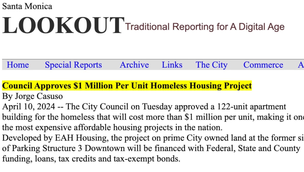 Instead, what we see are headlines about ultra-expensive government-built housing. For example, Santa Monica recently hit about 1 million dollars per unit on one homeless housing project. Another development in Skid Row has been reported at roughly 600,000 dollars per unit.