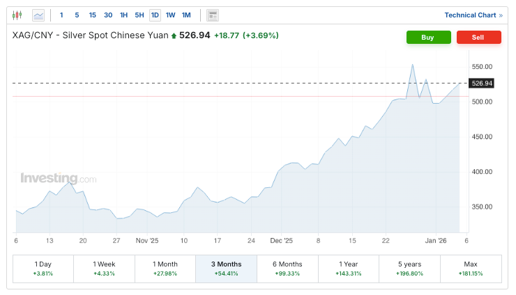 Because China dominates the manufacturing of solar panels and EVs, their domestic demand for silver is massive. This has caused silver to trade at a significantly higher price in Shanghai compared to London or New York (Investing.com).
