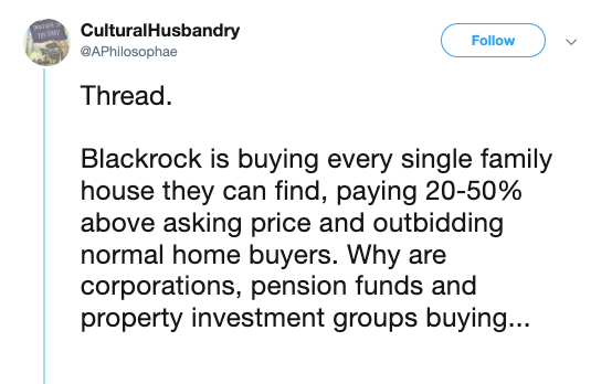 You may have seen a tweet claiming that “BlackRock is paying 20-50% above asking price” to outbid families and buy entire neighborhoods. (The tweet was deleted, but the archived version is here)
