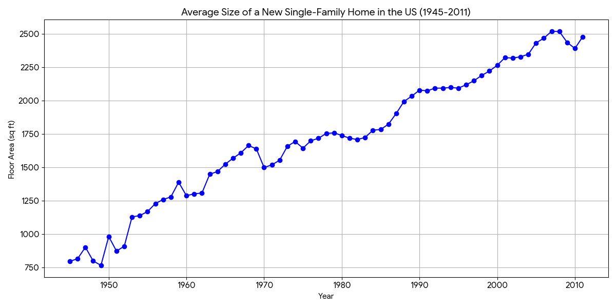 In 1950, the average new home was 983 square feet. It was a plywood box with no AC, 1 bathroom, and 2 tiny bedrooms. Today, the “standard” starter home is over 2,700 square feet.